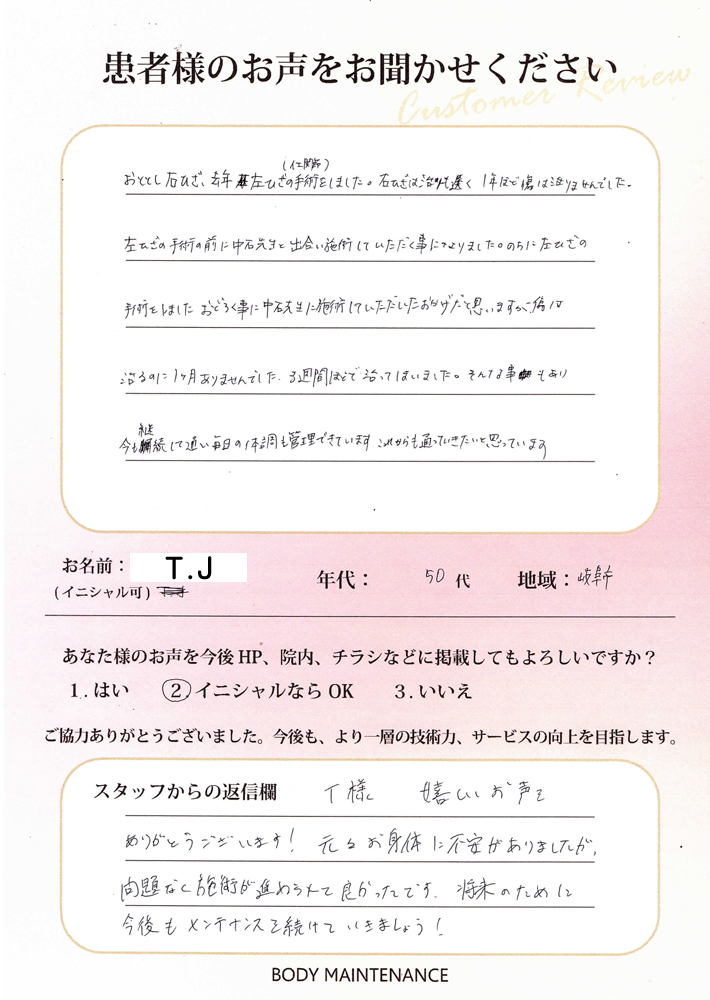 おととし、右膝、去年は左膝の手術をしました。右膝は治りが遅く、1年ほど傷は治りませんでした。左膝の手術の前に中石先生と出会い施術していただく事になりました。のちに左膝の手術をしました、おどろく事に中石先生に施術していただいたおかげだと思いますが、傷は治るのに1ヶ月ありませんでした。3週間ほどで治ってしましました。そんな事もあり、今も継続して通い毎日の体調も管理できています。これからも通っていきたいと思っています。