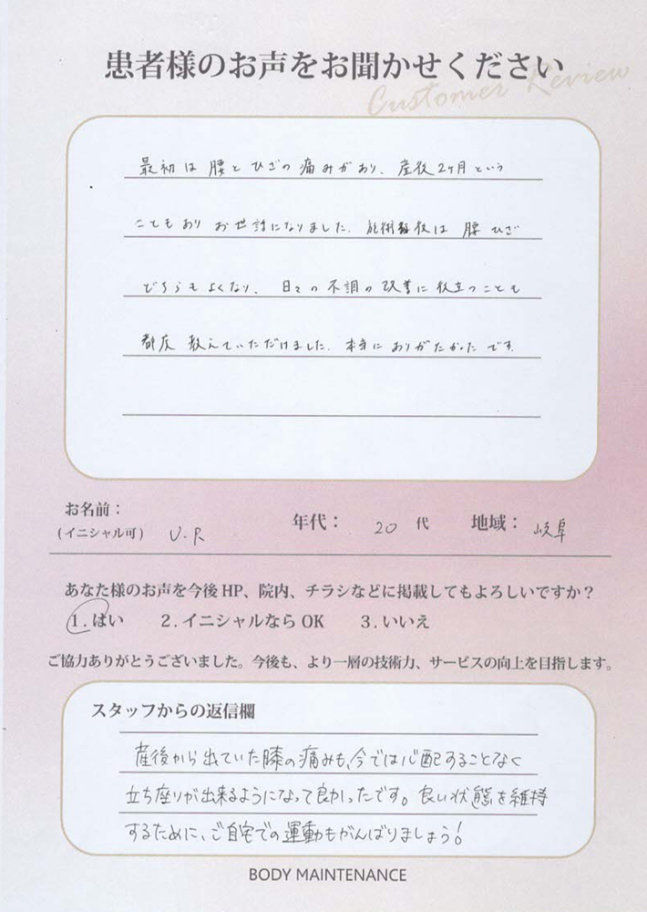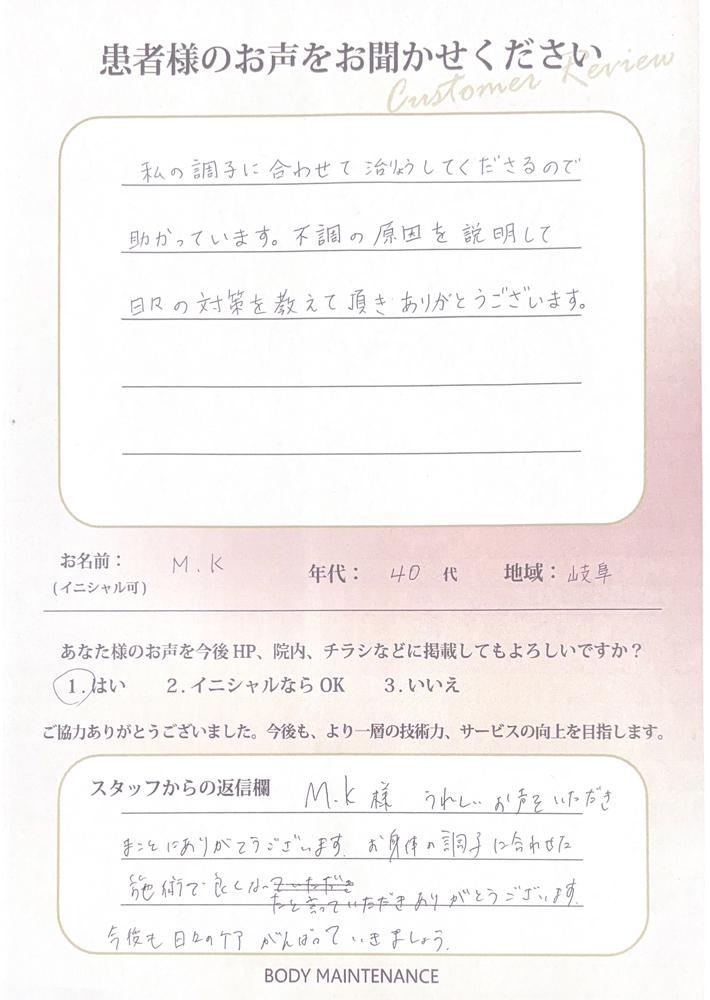 M.K様うれしいお声をいただきまことにありがとうございます。お身体の調子に合わせた施術で良くなったと言っていただきありがとうございます。今後も日々のケアがんばっていきましょう。