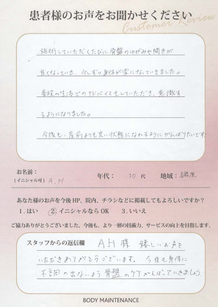 A.H様、嬉しいお声をいただきありがとうございます。今後も身体に不調の出ないよう骨盤のケアがんばっていきましょう。