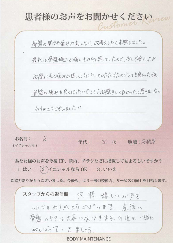 R様、嬉しいお声をいただきありがとうございます。産後の骨盤のケアは大事になってきます。今後も一緒にがんばっていきましょう。