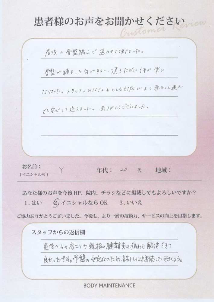 産後からの肩こりや親指の腱鞘炎の痛みも解消できて良かったです。骨盤の安定化のため筋トレは継続していきましょう。