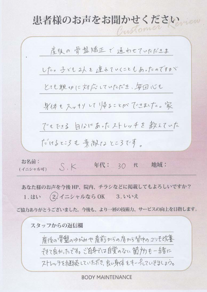 スタッフよりご返信欄今では骨盤の開き・歪みもキレイに整っています。お子様の成長に伴って肩こり・腰痛がでてきているので、しっかりケアしていきましょう。筋トレや家でのストレッチも、お家で頑張ってくださるので助かってます。痛みのない身体づくりの為、一緒に頑張っていきましょう!