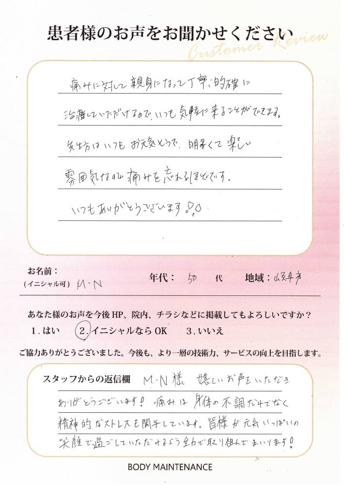 スタッフからの返信欄 M.N様、嬉しいお声をいただきありがとうございます!痛みは身体の不調だけでなく精神的なストレスも関与しています。皆様が元気いっぱいの笑顔で過ごしていただけるよう全力で取り組んでまいります!