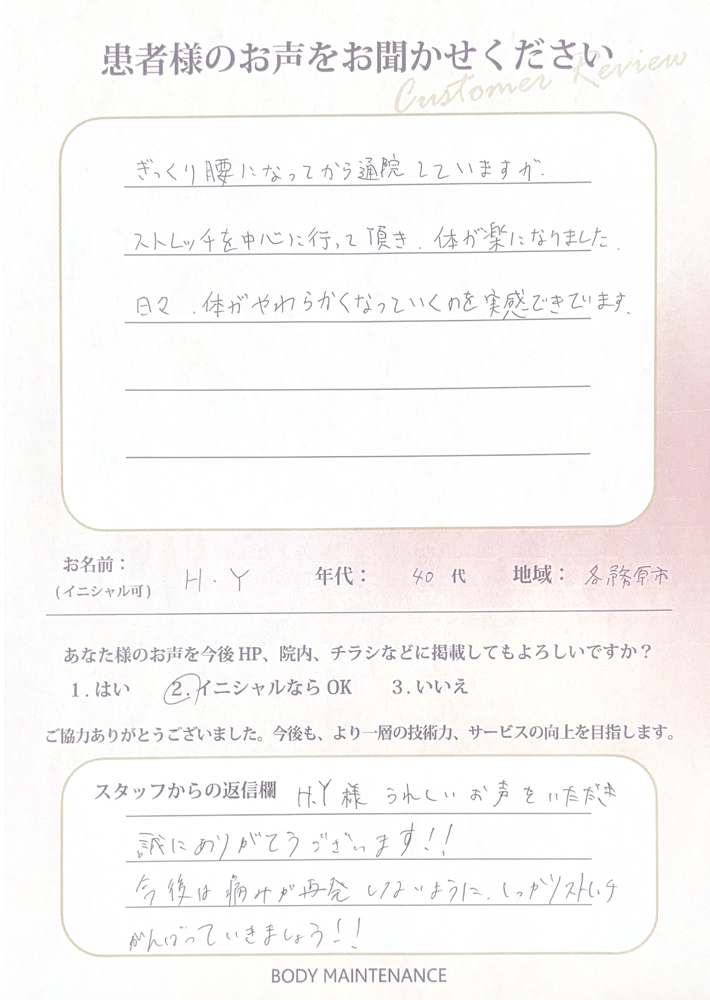 スタッフからの返信欄 M.M様ありがとうございます。腰の痛みも今ではなくなり良かったです。再発しないように筋トレがんばっていきましょう。