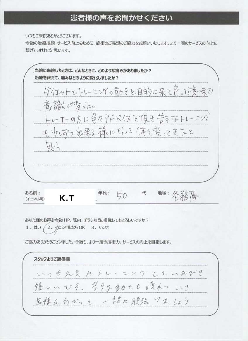ダイエットとトレーニングの動きを目的に来て色んな意味で意識が変わった。トレーナーの方に色々アドバイスを頂き苦手なトレーニングも少しずつ出来る様になって体も変わってきたと思う。
